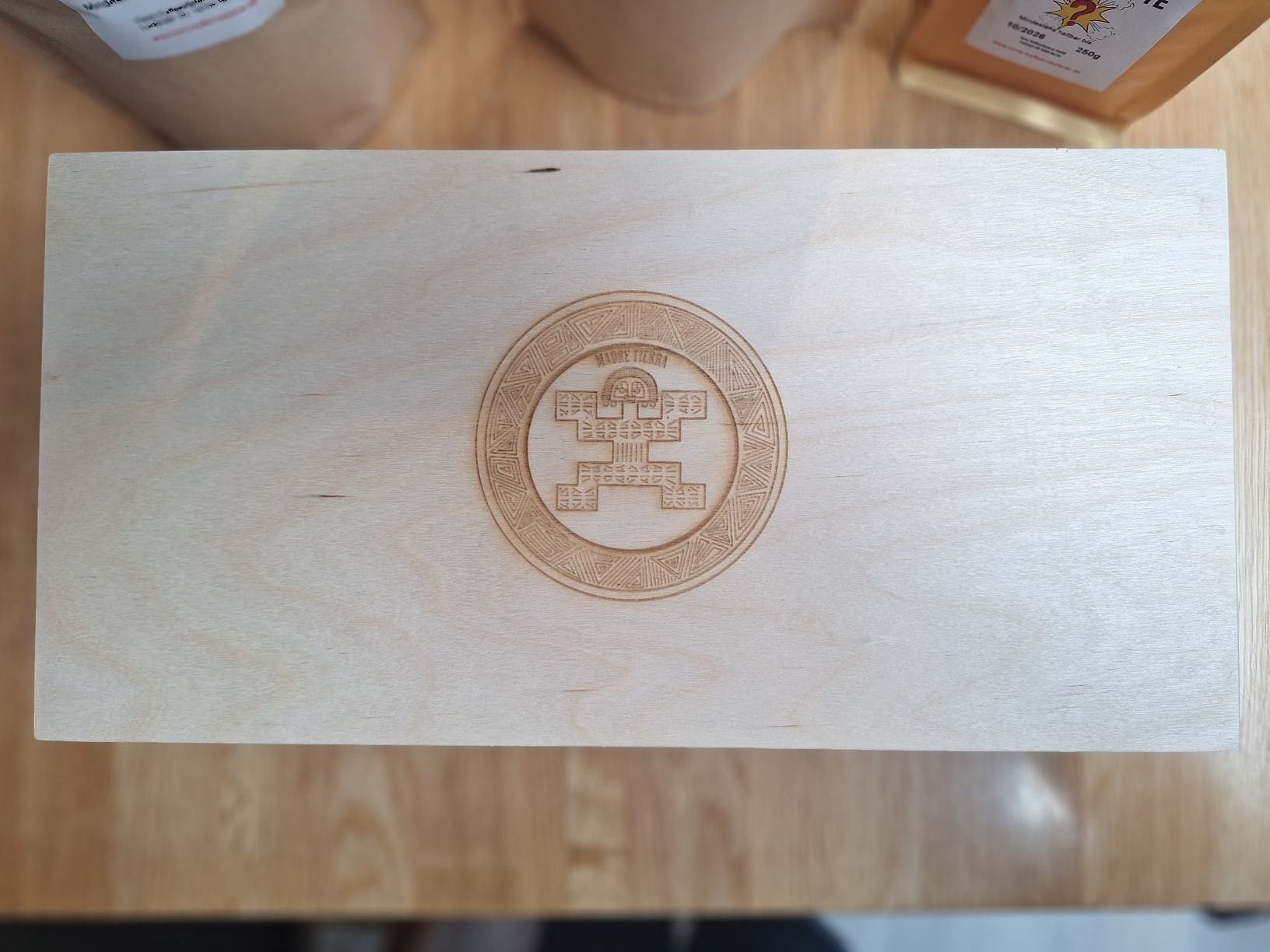 Material: Korpus 8mm Vollholz (Fichte/Kiefer). Deckel und Boden aus 3mm Birkensperholz, Ecken verzahnt. Metallscharniere und Verschluss (Goldfarben). Hochwertige Eigenproduktion von Carl Moser! Deckelprägung: gelaserte Inkagrafik mit „Madre Tierra“ Inschrift. Als Naturprodukt machen Abweichungen bzw. Unterschiede im Holz jede Holzverpackung zu einem Unikat!