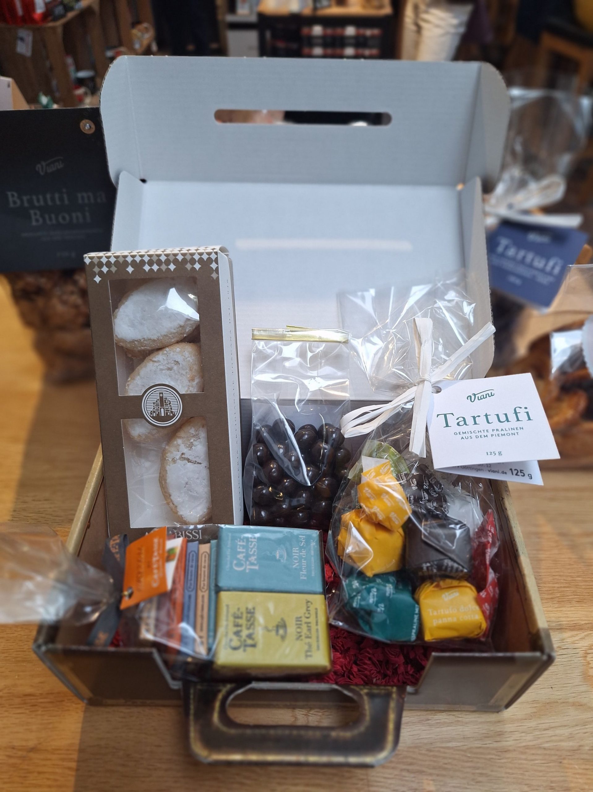 Karton, Motiv Retro-Reisekoffer, mit Genussfüllung! Füllung: 1 Karton Mandelgebäck (Marabissi) aus der Toscana 120g. 1. Tüte Belgische Schokoladentafeln (Café-Tasse) Brüssel 180g. 1 Tüte Schokobohnen Toms Kaffeerösterei 100g. 1. Tüte Tartufi dolce gemischte Pralinen aus dem Piemont 125g: Inhalt: Tartufi dolce pana cotta / Tartufi dolce caramello e nocciole salate / Tartufi dolce extraneri / Tartufi dolce al pistacchio / Tartufi dolce bianco. Gerne füllen wir die Schachteln auch nach Ihren Wünschen.